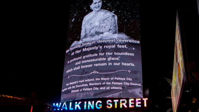 Ce 25 octobre 2025, des reporters ont décrit l’ambiance à Walking Street, Pattaya City, district de Bang Lamung, province de Chonburi, une destination prisée par les touristes thaïlandais et étrangers. Une pancarte à l’entrée affiche un message de condoléances suite au décès de Somdet Phra Nang Chao Sirikit Phra Borommarachininat Phra Borommarachonani Phannayiluang, en thaï et anglais : « Reste dans mon cœur pour toujours, s’inclinant devant Sirakran, aux pieds de Sa Majesté. Avec gratitude pour Sa bonté infinie », signé par le président de Pattaya City, son comité exécutif, conseillers et employés, ainsi que les citoyens.