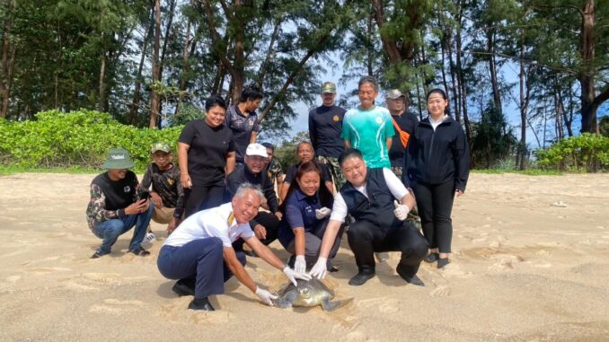 Le chef de district de Thai Mueang et le parc national Khao Lam Pi–Hat Thai Mueang ont relâché une tortue verte femelle guérie de ses blessures, après près de deux mois de soins dans un centre de préservation de la vie marine.