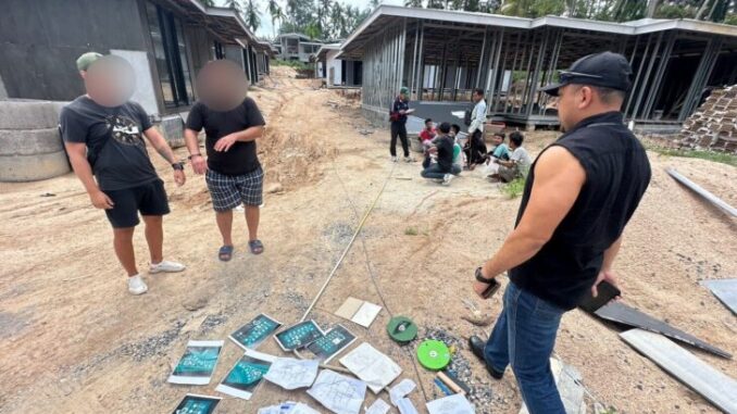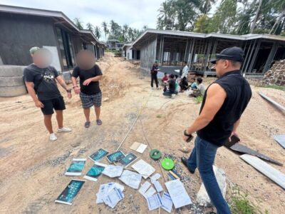L’opération a ciblé un chantier à Baan Sri Thanu, village 8, sous-district de Koh Phangan, district de Koh Phangan, province de Surat Thani. Les agents ont interpellé Viascheslav (29 ans, Ukrainien) et Ramis (26 ans, Azerbaïdjanais) pour « activité illégale (installation électrique)» et « étranger travaillant sans Work Permit ».