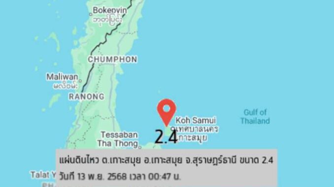 Selon les données officielles du site de la Division de surveillance des séismes du Département de la météorologie thaïlandaise (TMD), le séisme de magnitude 2,4 s’est produit le 13 novembre 2025 à 00:47:21 heure locale (17:47:21 UTC le 12 novembre). La rupture s’est produite à une profondeur de 4 km, l’épicentre est situé à 9,55°N, 99,956°E, précisément à 2,7 km au nord-est de l’île de Ko Samui. Des secousses ont été ressenties sur l’île, mais aucun dommage n’est rapporté à ce stade.