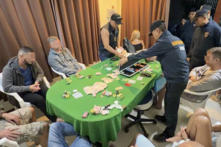 Le raid a eu lieu dans un resort du village n°1, tambon Koh Phangan. Les agents ont trouvé 10 étrangers assis en cercle autour d’une table de poker : cartes, jetons, machine à mélanger automatique et 134 950 bahts en cash.