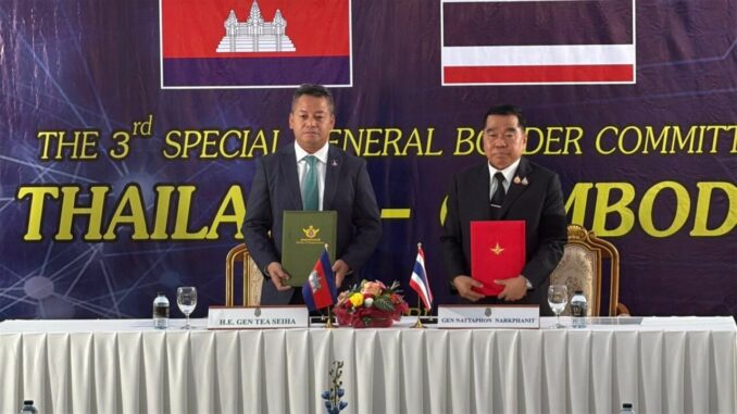 La réunion, tenue sous haute sécurité, a réuni le général Natthapol Nakpanich, ministre thaïlandais de la Défense et président du GBC thaï, avec le général Tea Seiha, son homologue cambodgien, accompagné du lieutenant-général Nyam Boraden, vice-chef de cabinet et secrétaire du GBC cambodgien. Objectif : valider les quatre points pour apaiser les tensions persistantes le long de la frontière, marquée par des accrochages croissants.