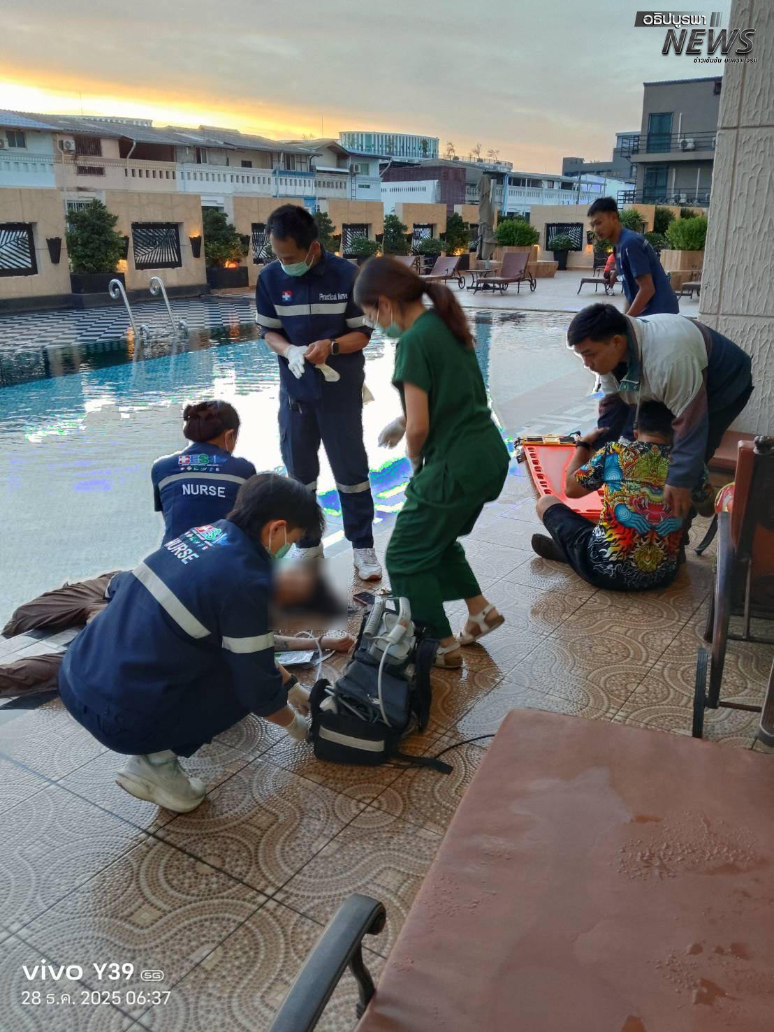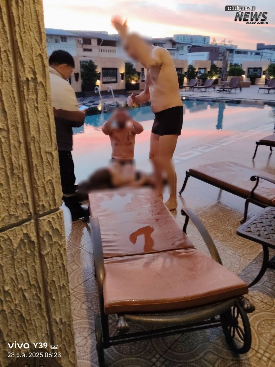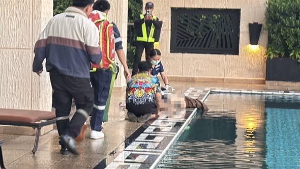 Sur place, les secours ont retrouvé Mme Emmiefa Alwarado, 26 ans, originaire de la province d’Udon Thani, grièvement blessée dans la piscine de l’immeuble après être tombée du 25e étage. Trempée et saignant de la bouche et du nez, elle a été immédiatement prise en charge et transportée à l’hôpital.