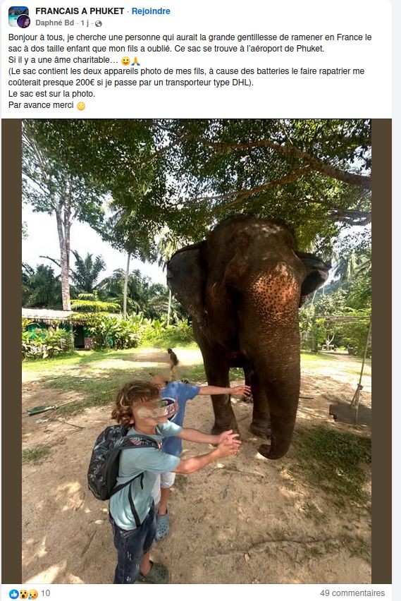 Dans ce post du 8 décembre, republié le réveillon de Noël (ces gens n’ont aucune âme), l’auteur décrit un sac oublié dans un Grab à Phuket, affirmant que le sac est désormais à l’aéroport. Le but ? Vous convaincre de prendre le sac en bagage et de le transporter vers l’Europe.
