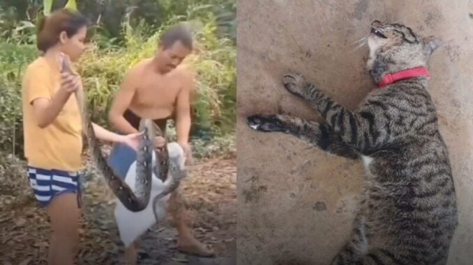 À Nakhon Nayok (dans la banlieue de Bangkok), une jeune femme enceinte a courageusement libéré son chat « Naruto » des anneaux mortels d’un immense python réticulé, sauvant l’animal in-extremis.
