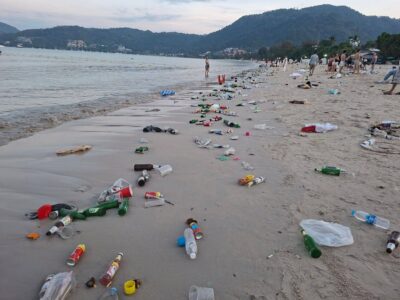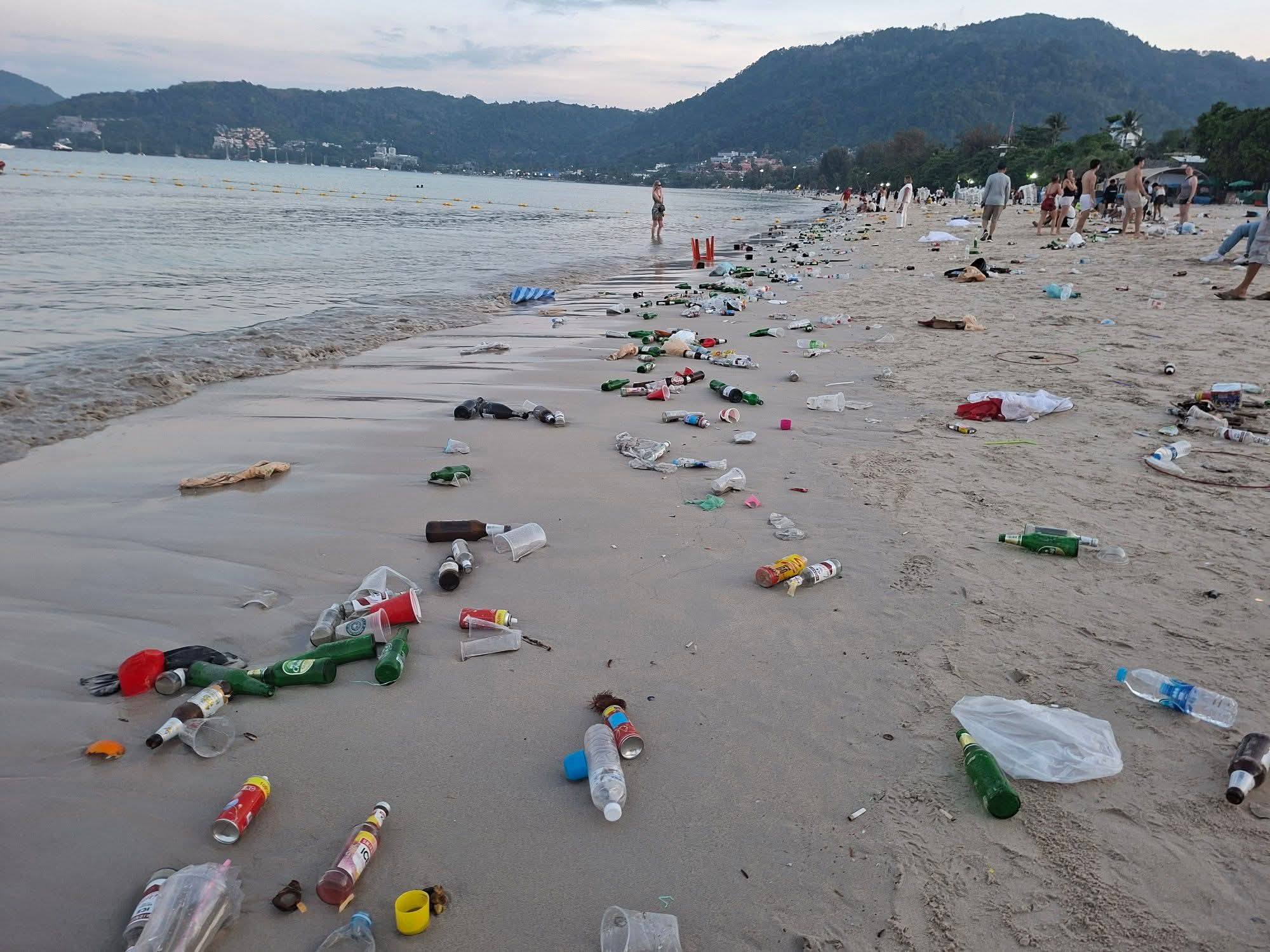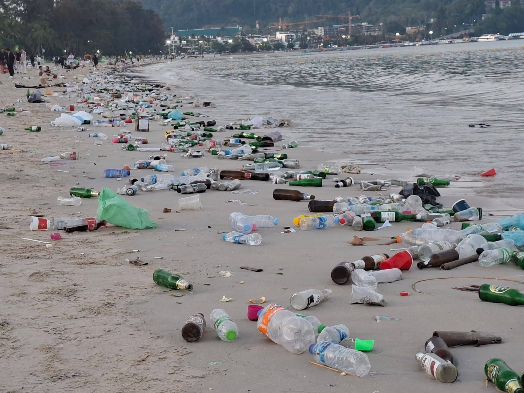 Le 1er janvier 2026, la plage de Patong à Phuket s’est réveillée couverte de déchets après le grand compte-a-rebours du Nouvel An, qui a attiré des milliers de touristes. Des photos et vidéos circulant sur les réseaux sociaux montrent des montagnes de bouteilles, plastiques, restes de nourriture et déchets divers abandonnés sur le sable.