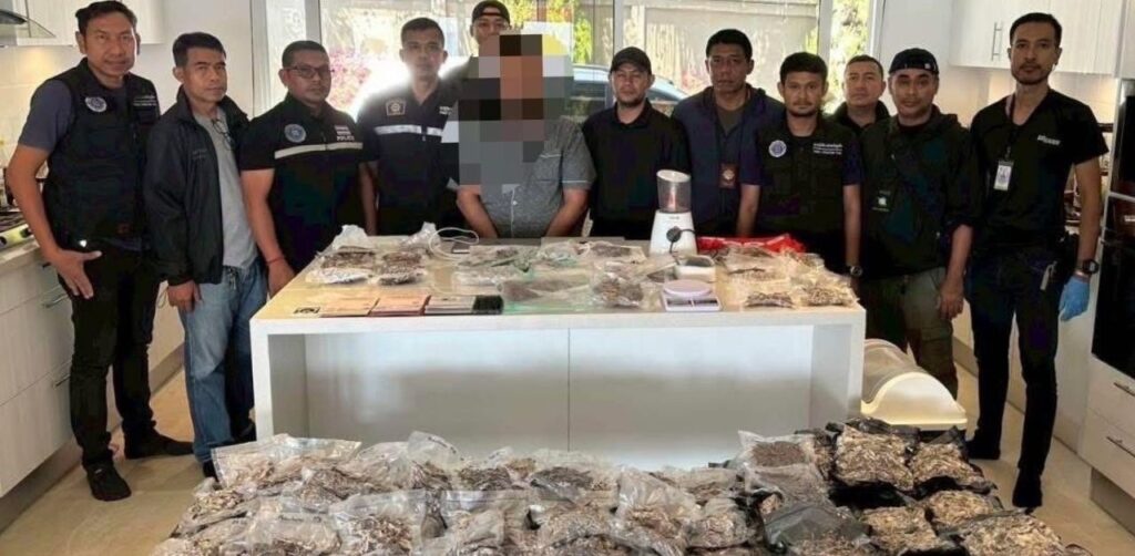 Une troisième personne, la Russe Landysh, impliquée dans l’activité, a réussi à s’échapper avant l’arrivée des forces de l’ordre. Les poursuites sont en cours pour la localiser. Les deux hommes sont poursuivis pour possession de stupéfiants de catégorie 5 en vue de la vente, en vertu des articles 93 et 148 de la loi sur le contrôle des stupéfiants : jusqu’à cinq ans de prison et 500 000 bahts d’amende.