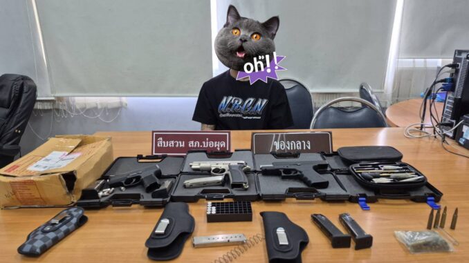 Dans le cadre d’une vaste opération anti-criminalité avant les élections, la police de Bo Phut a interpellé un jeune homme de 20 ans originaire de Buriram, en possession de trois pistolets modifiés type « blank gun » et de 35 munitions, dont 19 cartouches de calibre 5.56 mm (M16).