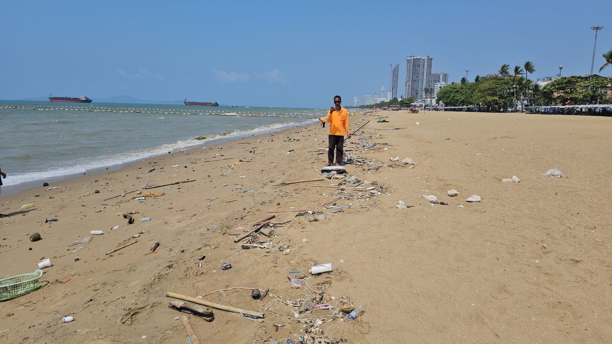 Le 22 février 2026, des reporters de Matichon se sont rendus sur la plage de Jomtien, dans la ville de Pattaya, district de Bang Lamung, province de Chonburi, après de multiples signalements de résidents et de touristes. Des quantités importantes de déchets ont été rejetées par les vagues sur une longue portion de la côte, altérant gravement l’image touristique et la sécurité des baigneurs.