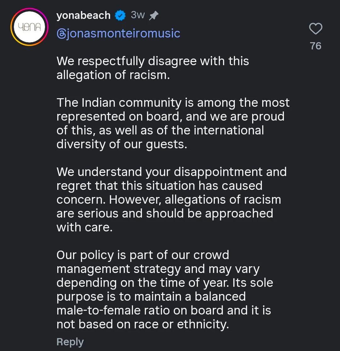 Le 19 janvier 2026, le musicien indien Jonas Monteiro, basé à Goa, s’est vu refuser l’accès au Yona Beach Club avec plusieurs amis malgré des réservations confirmées et payées.