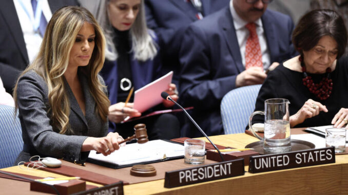 Selon l’ONU elle-même, aucune épouse ou époux d’un dirigeant en exercice n’avait jamais présidé une telle réunion. Traditionnellement réservée à l’ambassadeur américain (en l’occurrence Mike Waltz), la présidence mensuelle des États-Unis en mars a été utilisée pour offrir cette tribune symbolique à la Première dame.