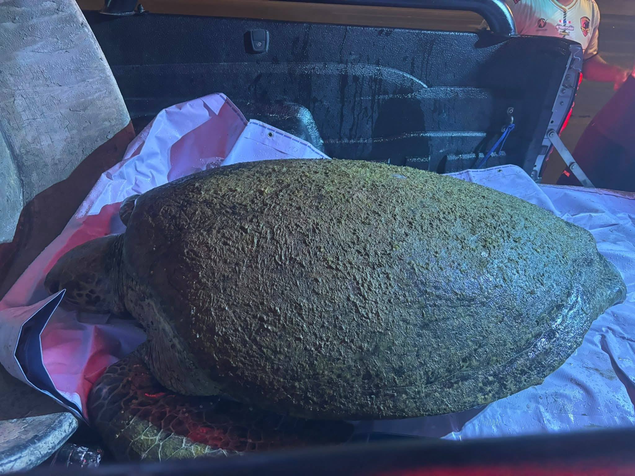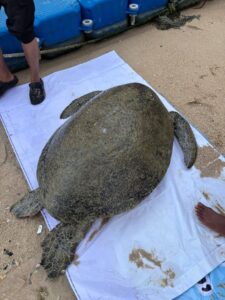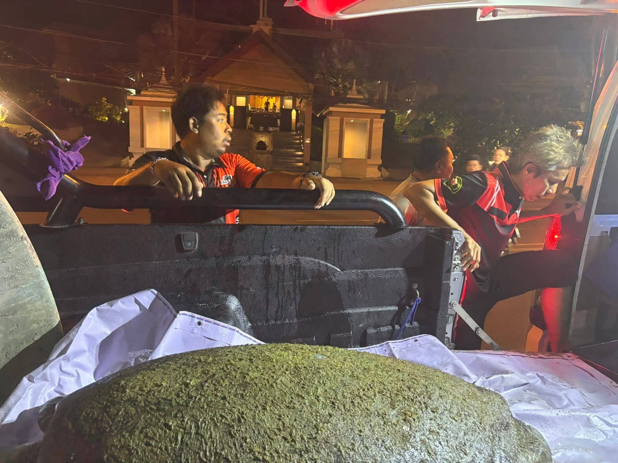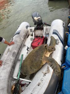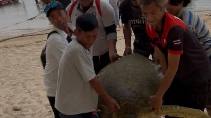 La station de pompiers de Rawai a reçu un appel à 18h10 de la part du conducteur de speedboat Nontsak, qui a signalé la découverte d’une tortue verte âgée d’environ 30 ans et pesant plus de 50 kg.