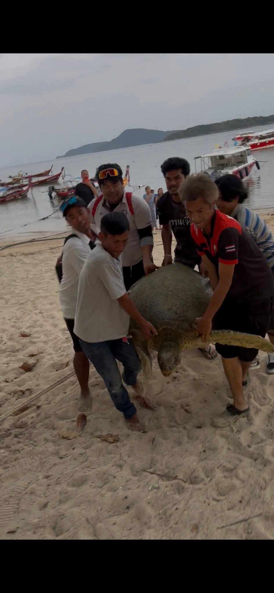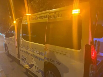 L’animal flottait dans les eaux près de l’arrière de Koh Bon. Le conducteur et les touristes à bord ont collaboré pour la capturer et la transporter jusqu’aux agents de Rawai, qui ont ensuite coordonné avec le centre de recherche côtier de la province de Phuket afin que des experts viennent la prendre en charge pour des soins appropriés.