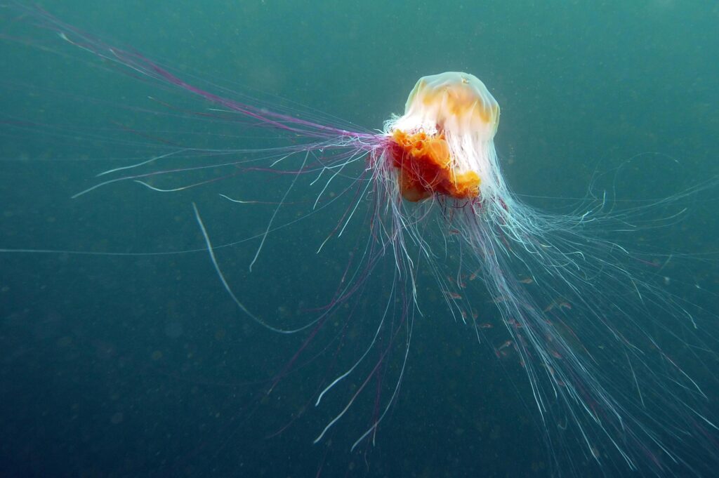 La méduse-lion (Cyanea capillata) est massive, avec une très grosse cloche jusqu’à 2 m et des centaines de tentacules. Généralement présente dans les eaux plus froides du nord, elle cause des démangeaisons modérées à sévères, mais rarement mortelles.